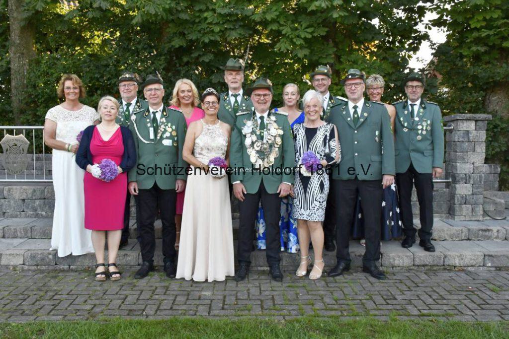 Der neue Holdorfer Schützenkönig Richard III. Zumloh und seine Königin Karin präsentieren gemeinsam mit den Adjutantenpaaren Christin und Olaf Böckmann (vorn links) und Jutta und Thomas Grünebaum (vorn rechts) den Hofstaat. Hintere Reihe von links: Sigrid und Arnold Dinkgrefe, Sigrid und Jürgen Plewa, Stephanie und Jan-Dierk Brand sowie Sigrid und Reinhard Klose. (Fotos: Vollmer)